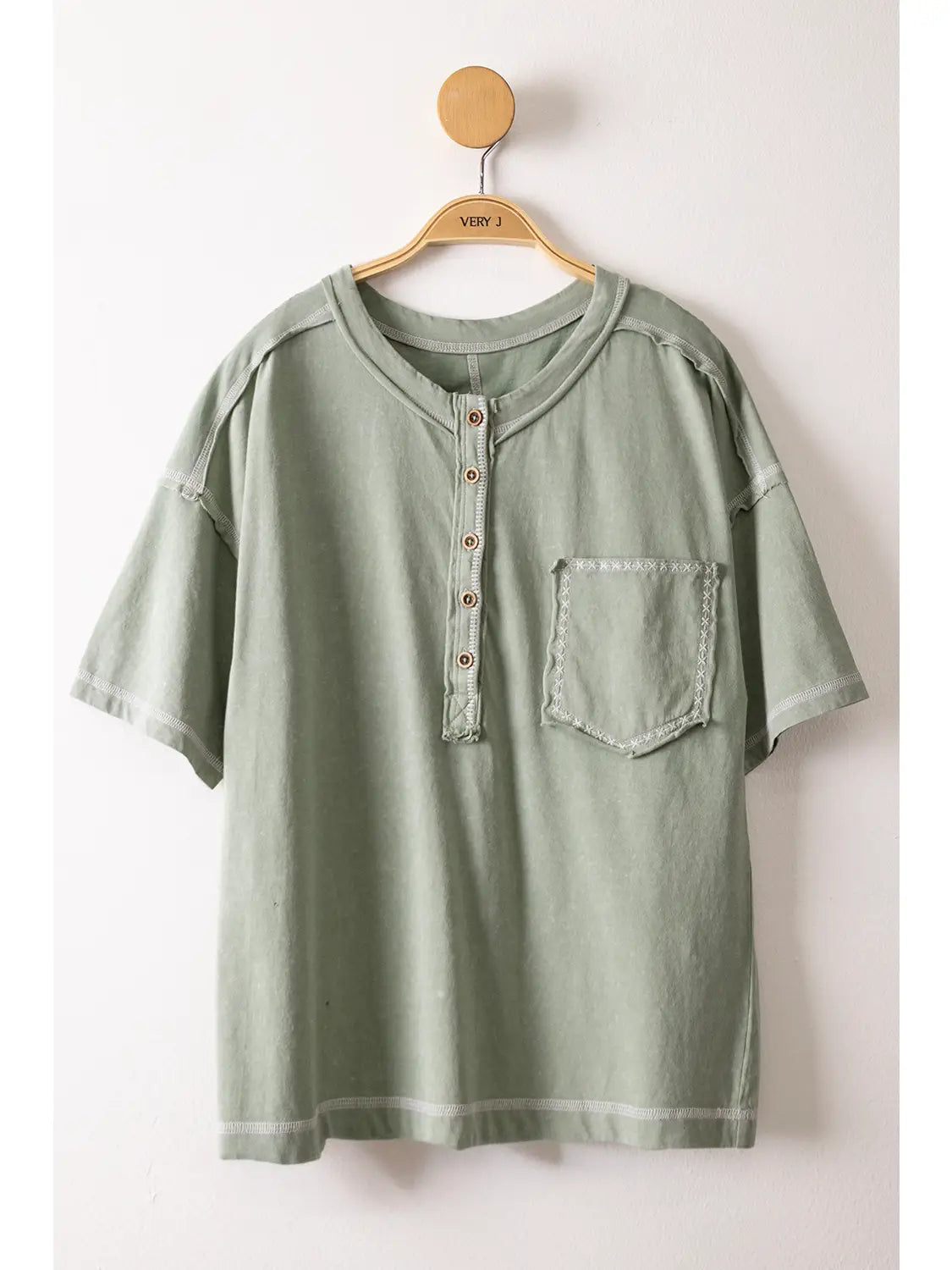 Effortless comfort meets laid-back style with this mineral washed knit top. The oversized silhouette drapes beautifully while the half button-down front offers versatile styling options. Practical patch pocket adds function, and raw edge detailing with signature stitching gives it an intentionally relaxed, lived-in look. Perfect for casual days when you want to feel cozy without sacrificing style.